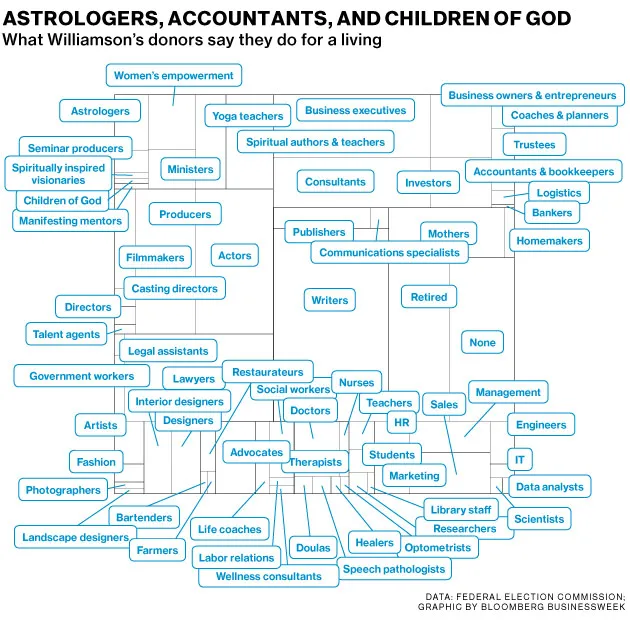 威廉姆森,61岁,是13本关于灵性的畅销书作者,也是著名的新纪元大师,尽管她讨厌这个词。她希望将她的220,000 推特粉丝和456,000 脸书点赞——以及数百万读者——转化为一个将为她投票的选民基础。她想要取代加州第33国会选区的民主党代表亨利·瓦克斯曼,后者在任20届后退休。该选区涵盖比佛利山、贝尔艾尔、布伦特伍德、太平洋帕利塞德、马里布、圣塔莫尼卡和威尼斯,然后弯曲包括同样富裕的赫莫萨海滩和帕洛斯维尔德半岛。该选区的人均收入最高,每年60,000美元,房屋中位价值最高,为911,000美元,是全国任何选区中最高的。这里富裕、白人且自由;巴拉克·奥巴马在他两次竞选中获得了超过60%的选票,该选区为他的竞选捐赠了数百万。第33选区是杰弗里·卡岑伯格和海姆·萨班等捐赠者的家园,还有一大批其他自由派亿万富翁。谁控制第33选区,谁就成为权力中介:几乎每位有全国抱负的民主党候选人都会停下来提取资金。