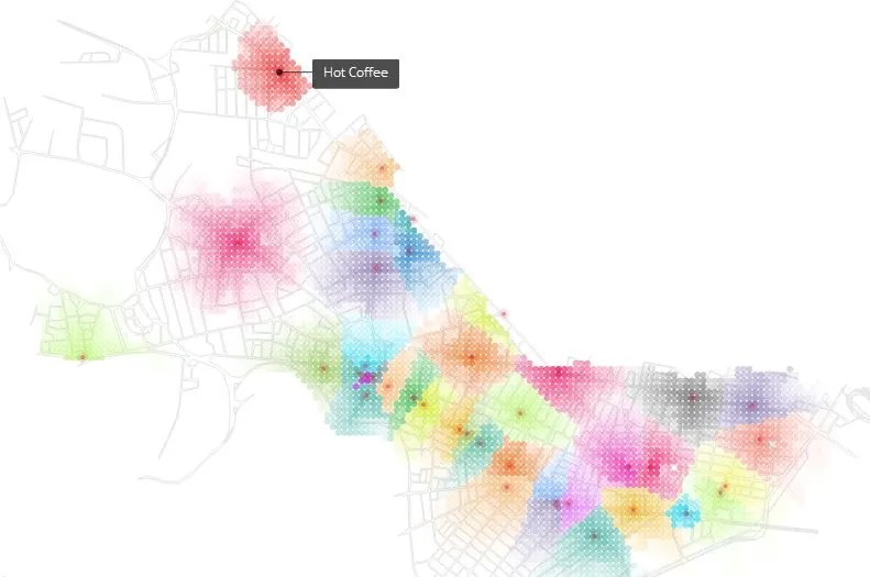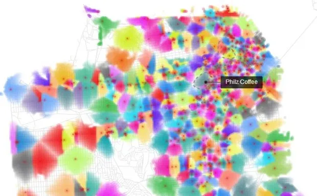 首先,这是历史上最无聊的地盘战争之一,瘦削的胡子男试图在不洒出他们的玛奇朵的情况下互相攻击。但这也是这个华丽的,彩虹色的地图,展示了咖啡店及其服务的社区,由麻省理工学院社会计算组的数据显示魔术师们创建。