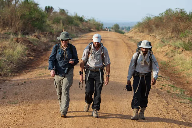 在第三个早晨,伍德计划离开道路,穿过阿贾伊野生动物保护区,这是一个靠近河岸的干燥沼泽,枯萎的草高达6到7英尺。两名护林员加入了他们,使队伍人数增至七人。与前两天不同,水将会稀缺。在早餐时——一碗粥,伴随着宁静的尼罗河景色——马特提议他和弗洛里奥当天只走伍德计划的距离的一半(大约12英里),然后在穿过保护区的道路上搭便车。他们会提前到达营地,拍摄伍德和其他人接近的画面。弗洛里奥欣然同意。
