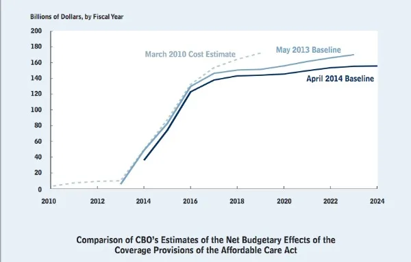这紧随另一条好消息之后,即该法律已超过700万人注册的目标。上周,离任的卫生与公共服务部部长凯瑟琳·西贝lius 告诉国会,在开放注册期间,有750万人注册,而该注册期原本应在3月最后一天结束。由于奥巴马政府决定给予在3月31日截止日期之前开始注册过程的任何人延长至4月15日完成注册,因此最终人数可能接近800万人。 正如下面CBO报告中的图表所示,这并不是《平价医疗法案》的成本估算首次下降: