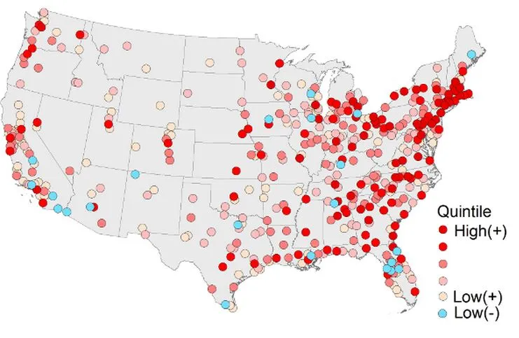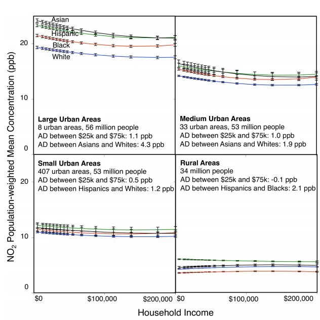 “即使只考虑高收入个体,仍然看到环境不公正让我有点惊讶,”马歇尔说。至于为什么会发生这种情况,这仍然是进一步调查的主题;马歇尔指出,一个理论是更多的非白人倾向于居住在污染丰富的市中心地区和高速公路附近。