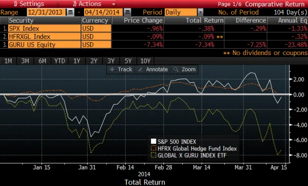这张图表显示了标准普尔500指数、HFRX全球对冲基金指数和全球X Guru指数ETF(一个试图重现特定对冲基金经理表现的交易所交易基金)在第一季度的回报: