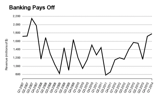 尽管债券销售略显缓慢,但股票发行和并购建议支撑了利润。股权承销收入激增12%,高盛的路演团队将Coupons.com和Intrawest Resorts等大型交易推向市场。与此同时,其顾问工作的收入则跳升了41%。