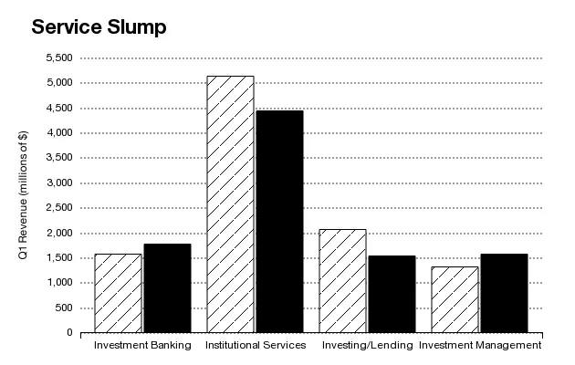虽然合并和首次公开募股可能是高盛的强项,但该公司大部分收入来自于为机构客户提供服务,这个术语涵盖了一系列活动——从为大学捐赠基金购买股票到为希望押注巴西干旱的对冲基金锁定咖啡合同。这些订单在上个季度并不活跃,这就是为什么高盛的利润同比下降了10%,降至20亿美元。