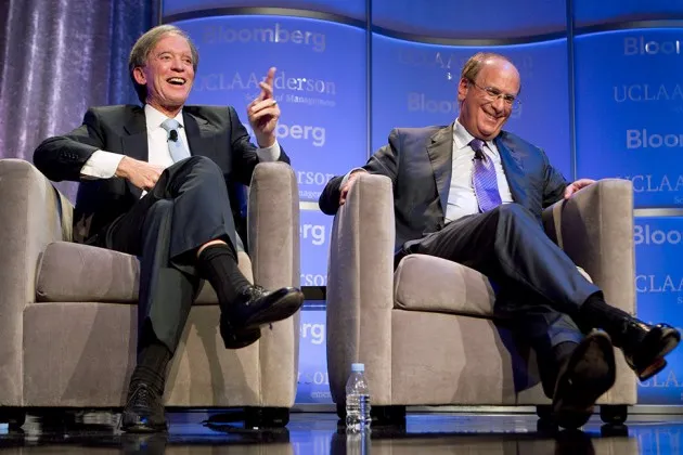 比尔·格罗斯(左)和拉里·芬克在2011年摄影:安德鲁·哈雷尔/彭博社债券市场已成为巨人的土地。比尔·格罗斯和拉里·芬克管理的债券投资组合总值达到3万亿美元。他们所经营的公司,Pimco和贝莱德,自2008年以来其持有的债券数量翻了一番,超过了市场50%的增长。根据晨星的数据,Pimco、先锋集团和富达投资管理着所有共同基金拥有的应税债券的39%,而1997年这一比例为18%。