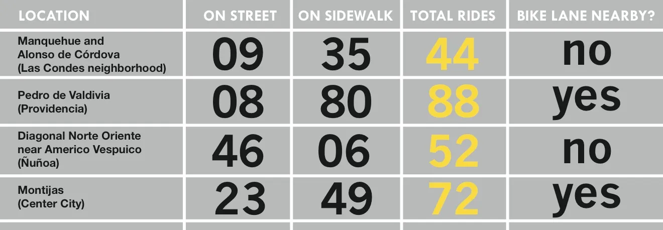 这些90度转弯是圣地亚哥自行车网络中的设计缺陷之一。图片由全球绿色通道提供(左);圣地亚哥早高峰期间的自行车交通堵塞。来源:Latercera.com右侧面对这样的挑战,许多骑自行车的人开始走上圣地亚哥的人行道。智利女性骑行团体Macleta的一项最新研究发现,在四个观察点中,有两个点的人行道骑行占主导地位,豪华市中心普罗维登西亚的骑行者占90%,而住宅区拉斯孔德斯的骑行者占80%。只有在普罗维登西亚南部的Ñuñoa区,大多数(88%)骑行者更喜欢街道。在四个观察点中的两个,距离仅几个街区就有自行车道。