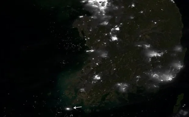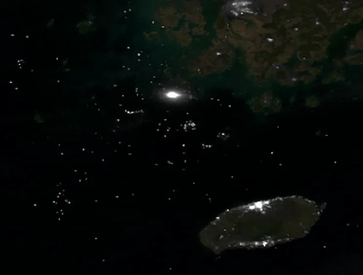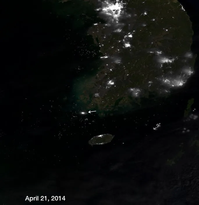 自上周以来,沉没的世越号渡轮——截至最后统计大约已造成100人遇难,仍有200人失踪——吸引了一支虚拟的援助舰队。新发布的卫星图像来自美国国家航空航天局和国家海洋和大气管理局,揭示了该国西南海岸附近的疯狂海洋活动(寻找白色箭头)。为了进行大小比较,渡轮位置下方岛屿顶部最亮的灯光聚集区是济州岛,人口大约435,000: