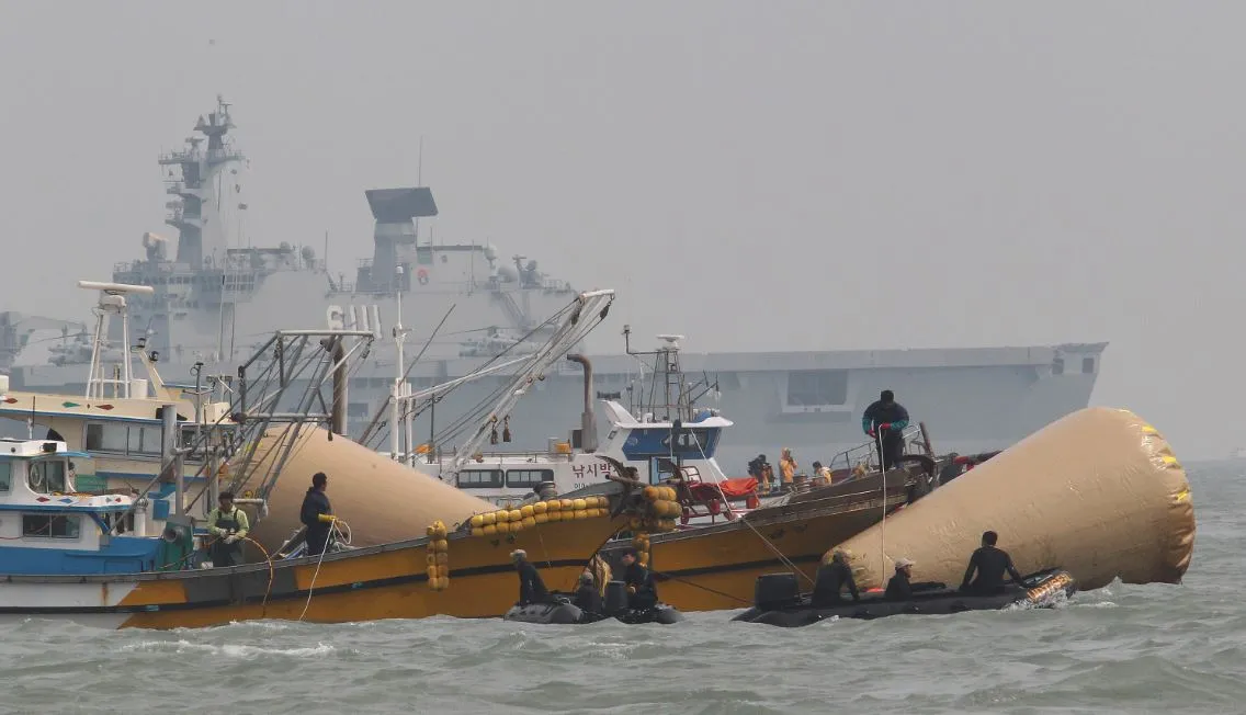 那么水中有什么呢?在上面照片的背景中可以看到庞大的韩国两栖攻击舰,以及据报道一艘驱逐舰和一艘导弹护卫舰以及许多较小的支援单位。飞机和直升机正在监视现场,三台大型起重机在附近,以备需要将沉没的船只从海底抬起。人们正在向天空发射刺眼的信号弹。尽管从上方看不见,潜水员已经进入船只漆黑的内部,打捞出许多尸体,包括许多来自首尔附近一所高中的学生和教师。