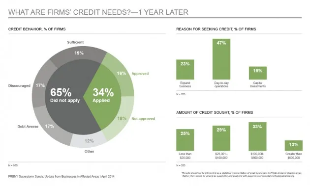 这些新数据来自纽约联邦储备银行每年两次的小企业贷款研究,收集了2013年底950家位于联邦政府灾区的小企业的反馈。超过一半申请信贷的受访者被拒绝。