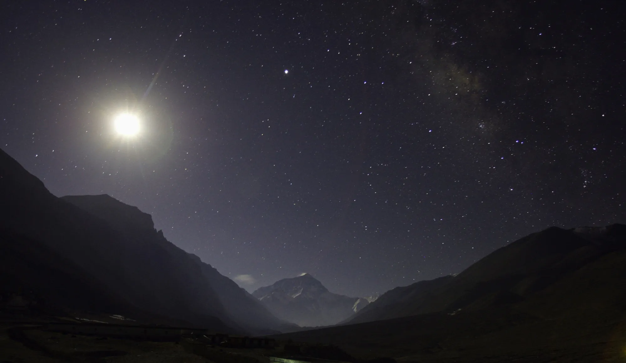 2008年,从西藏自治区的珠穆朗玛峰大本营附近可以看到月亮和星星照亮了珠穆朗玛峰。大卫·格雷/路透社