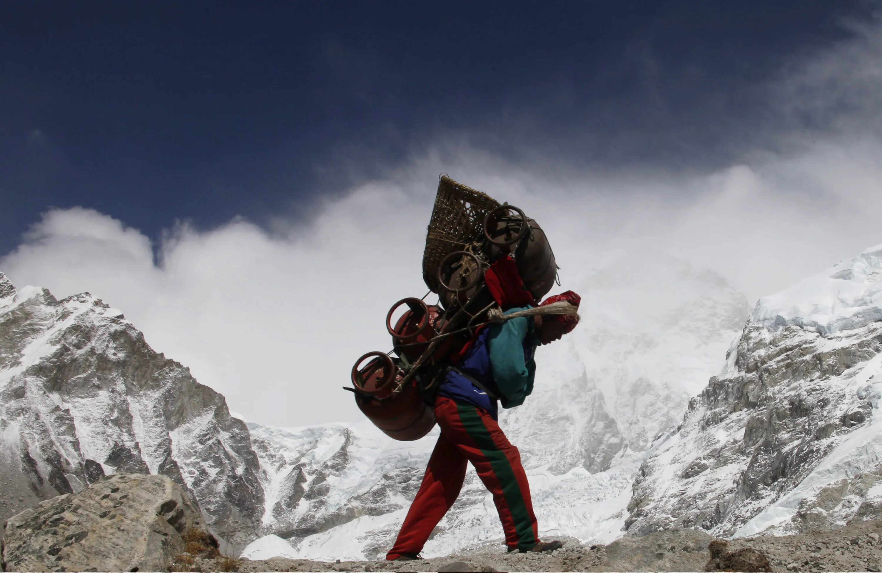 尼泊尔的搬运工背着负重从尼泊尔的珠穆朗玛峰大本营走过。搬运工们走了几个星期,有时背负的物资比他们自己的体重还重。他们休息时不坐下,而是依靠木杖支撑篮子。劳伦斯·谭/路透社