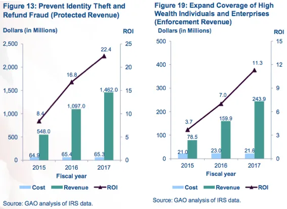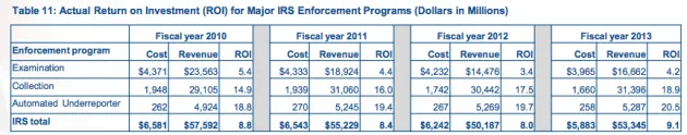 往年的数据显示,政府在几个主要执法项目上的支出超过了收入。国税局在审计上每花费1美元,就能收回3.40到5.40美元。其征收操作的回报甚至更高。