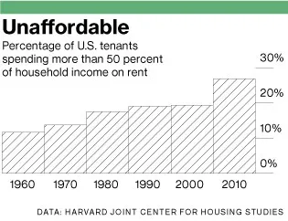 随着伍德兰公园等社区在全国各地的城市消失,负担得起的住房变得越来越难以找到。根据哈佛大学住房研究联合中心2013年的一份报告,四分之一的租户现在将超过一半的收入用于住房,而十年前这一比例为五分之一。根据研究公司Axiometrics的数据,过去五年全国公寓租金上涨了16%。在硅谷,租金的激增尤为明显。在帕洛阿尔托,平均公寓租金在过去五年中上涨了超过45%,到2,604.69美元(截至2月),根据Axiometrics的数据。