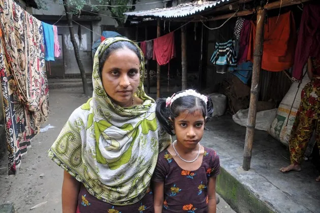 阿赫特和她的女儿瑞莎,站在他们称之为家的小屋旁摄影:梅胡尔·斯里瓦斯塔瓦为了给女儿提供她和母亲都没有的机会,纳兹玛·阿赫特为一个贫穷、文盲的孟加拉国女性做出了唯一的选择。她逃离了自己的村庄,锁上门以防母亲追赶。她搬到了首都达卡,开始住在一个和停车位差不多大小的小屋里。她每天工作12小时,制作牛仔裤、T恤和裙子,月收入不超过98美元。