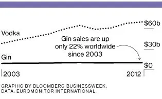 帝亚吉欧的戈登(Gordon’s),零售价格约为30英镑的一半,约占英国市场的46%,根据IWSR的数据。然而,皮尔金顿表示,销售在过去几年中一直在下降或停滞。根据IWSR的数据,2012年标准价格的金酒销量增长了2.3%,而戈登的销量仅增长了0.8%。