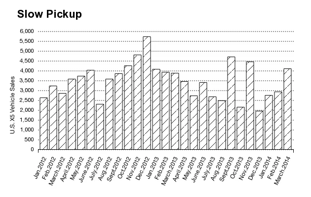 即使是去年秋天推出的新X5也需要一些时间才能跟上速度。从11月(新车型进入经销商)到3月的销量下降了18%,尽管上个月显示出了一些复苏的迹象。也许结局不会那么紧张。