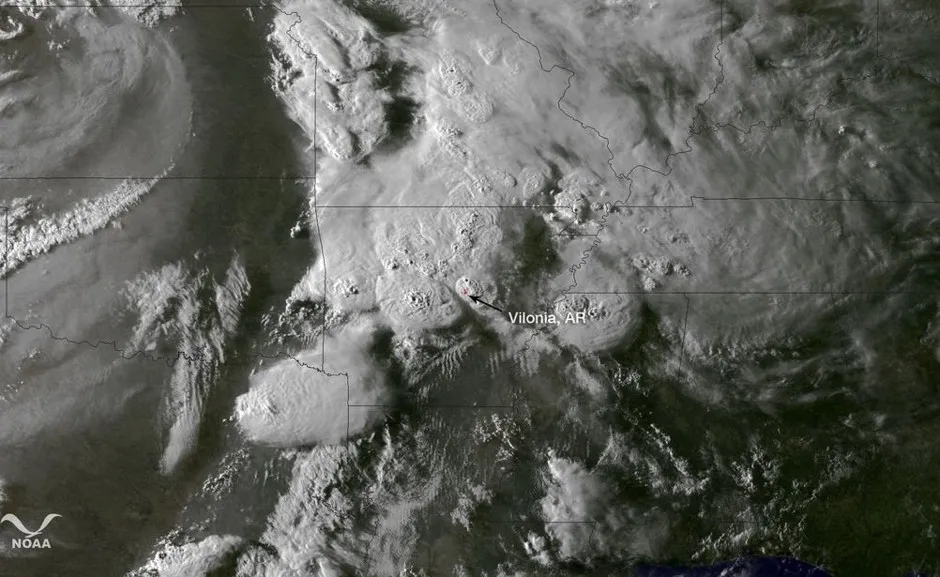 维洛尼亚和梅花镇,阿肯色州,是两个遭遇严重破坏的城镇。上面的图像来自NOAA,显示了在周日这些地方报告龙卷风前约一个小时的大气扰动。随之而来的强风将车辆像软木塞一样翻转,CNN报道: