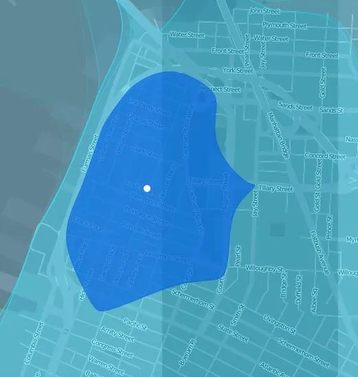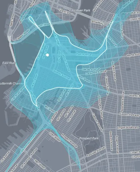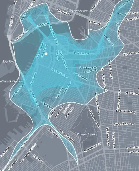 这个距离在下午4点像水母一样缩小。你仍然可以进入曼哈顿,但只是勉强,而公园坡和红钩是禁区: