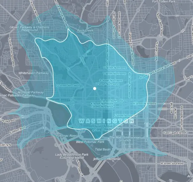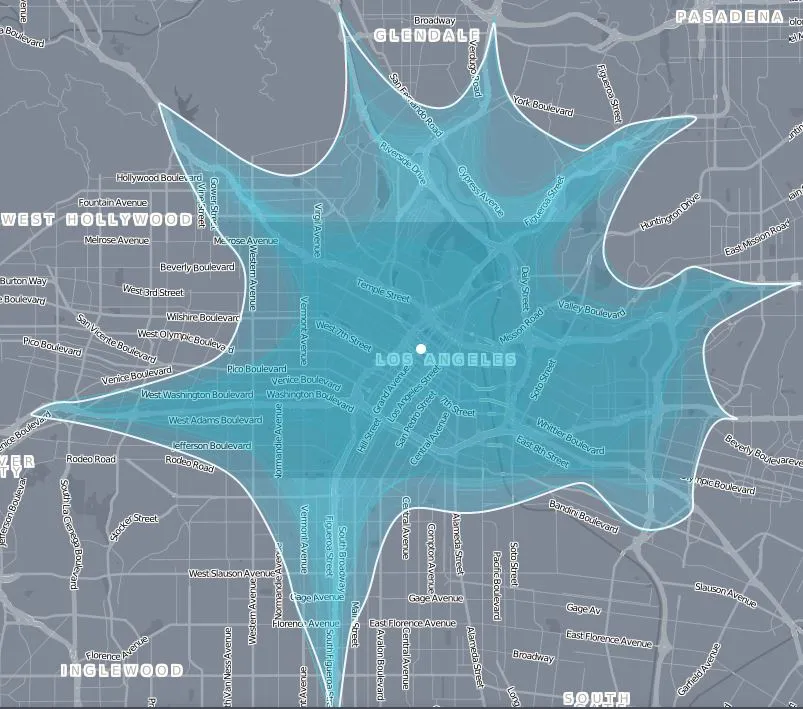 为了好玩,我在美国主要城市周围绘制了一些10分钟的行程。这是周六下午1点从洛杉矶当代艺术博物馆出发的假设移动景观: