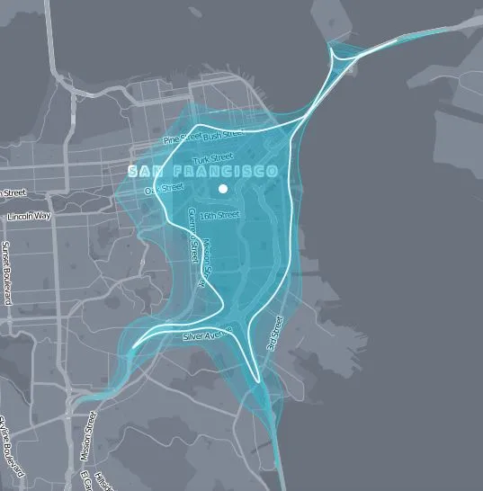 等距图并不是一种用于从A点到B点的服务。它更像是一种探索在旅行条件每小时变化的地区的流动性的方法。首先,将地图缩放到世界上任何地方,然后点击它以设置您的想象中的旅行者。然后会形成一个幽灵般的、半透明的存在,满是斑点和触须。这个天蓝色的形状实际上是24个不同的层,代表一天中的所有小时。将鼠标移动到地图底部的小时上,形状的轮廓会扩展和收缩,以显示您在预选的两到十分钟的车程中可以到达多远。