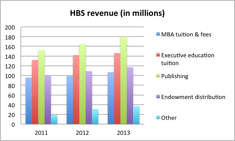 即便在这种情况下,哈佛商学院的 筹款计划 目标为10亿美元,显得尤为突出。该活动自2012年开始进入“静默阶段”,显然,已经筹集了6亿美元。这比 5亿美元的哥伦比亚商学院为新校园筹集的资金还要多,也超过了 3.5亿美元的西北大学凯洛格管理学院去年宣布的筹款活动。 除了哈佛商学院希望筹集的巨额资金外,更值得注意的是,哈佛商学院可能并不太需要这些资金。正如图表所示,哈佛商学院从非学位的高管教育项目和出版其他商学院使用的案例研究中获得了大部分 年度收入(PDF),这些收入来源几乎没有其他学校能够以如此规模获取。