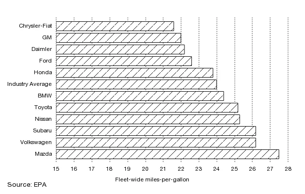 总的来说,根据本周环境保护局发布的 报告(PDF),美国车辆的平均效率去年上升到24英里每加仑。虽然不算差,但每个汽车制造商预计到2025年其整个车队的平均值要超过54.5英里每加仑。汽车行业还有很长的路要走——尤其是底特律(和意大利)的三大巨头。以下是目前的情况: