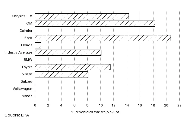 当然,为什么 福特、 通用汽车 和克莱斯勒处于落后地位并不神秘。他们正在制造并销售大量的皮卡。 马自达、 大众汽车和斯巴鲁则没有销售任何平板车。外国制造商则专注于SUV,其中许多车型如今的油耗较低。以下是基于这些公司生产的车辆中有多少百分比是皮卡的情况: