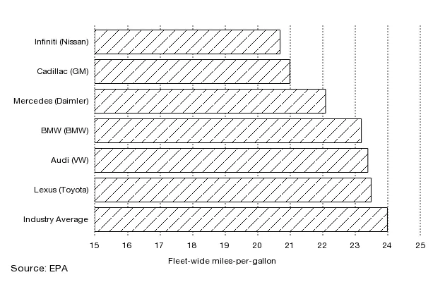 最后这个图表也有助于解释凯迪拉克奇怪的 新ELR混合动力轿跑 和为什么 宝马 向其 i8碳纤维飞船 投入了大量资金。与此同时,梅赛德斯 以超越油耗限制而臭名昭著。