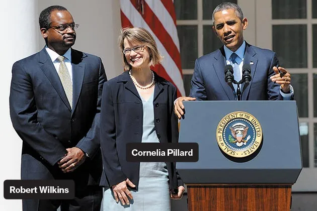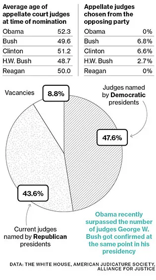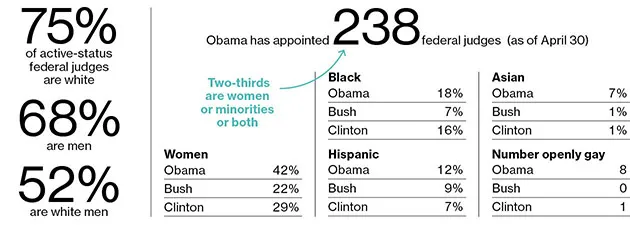 2013年6月14日:宣布提名美国哥伦比亚特区巡回上诉法院法官摄影:Olivier Douliery/Abaca USA奥巴马总统回应了民主党人对联邦司法系统的呼吁,希望其更能代表美国的多样性。截至4月,他已任命的黑人、西班牙裔、亚裔和公开同性恋法官,以及女性法官的数量,超过了他的任何前任。在司法提名方面起步缓慢,并经历了多年的共和党阻挠后,他超越了乔治·W·布什在其总统任期同一时点所任命的联邦法官数量——这在一定程度上得益于参议院民主党去年推动通过的一项规则,结束了利用阻挠法案来阻止提名的做法。奥巴马已填补了238个联邦法院席位,而民主党任命的法官现在在13个美国上诉法院中有9个法院的现任法官中占据多数,而他上任时只有一个。