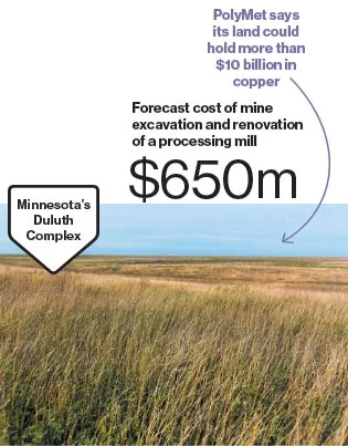 切里的乐观来源于多伦多的PolyMet在杜鲁斯复合体顶部控制的5平方英里的森林,这是一种地下岩石构造,被认为蕴藏着世界上最大的未开发铜和镍宝藏,以及大量的铂、钯、钴和黄金。