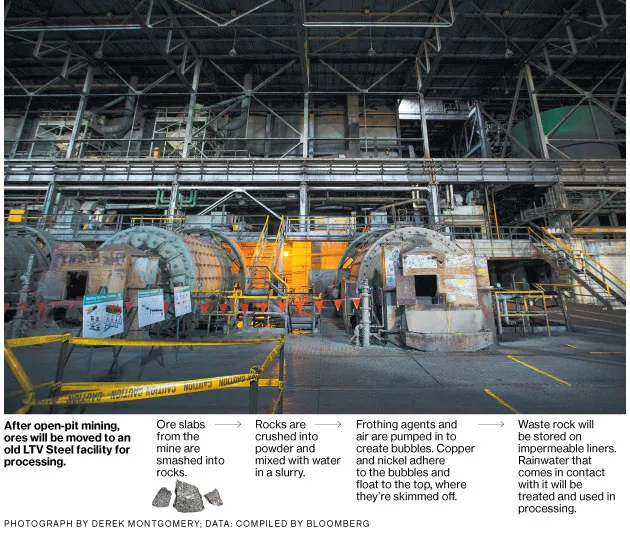 该公司提议花费6.5亿美元在超级国家森林的湿地上开采露天矿,并翻新旧的LTV工厂。(切里表示,该工厂使PolyMet在潜在竞争对手面前具有优势,因为后者需要花费超过10亿美元来建造自己的工厂。)岩石将从深达700英尺的爆破孔中开采,然后运送到约6英里外的工厂。