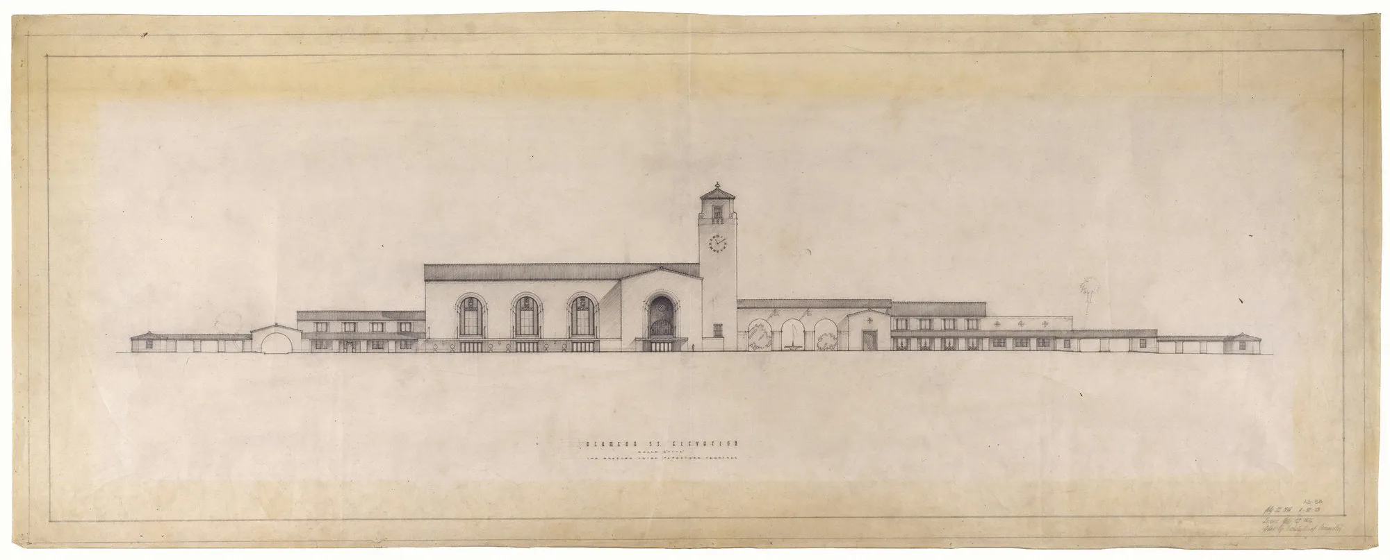 唐纳德·帕金森和约翰·帕金森。阿拉米达街立面,洛杉矶联合客运站,1936年7月16日。纸张:65.1 x 165.4 厘米(25 5/8 x 65 1/8 英寸)盖蒂研究所