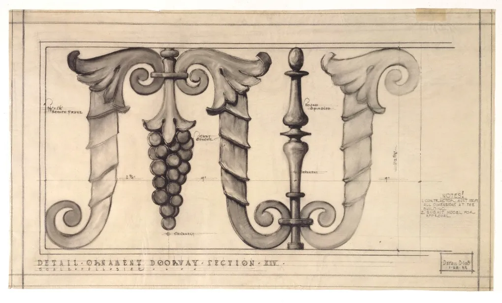 华莱士·C·邦索尔,美国,1902-1986年。东墙主大厅第XI部分,1938年。炭笔,石墨铅笔,建筑羊皮纸。纸张:46 x 98.8 cm (18 1/8 x 38 7/8 in.) 盖蒂研究所。