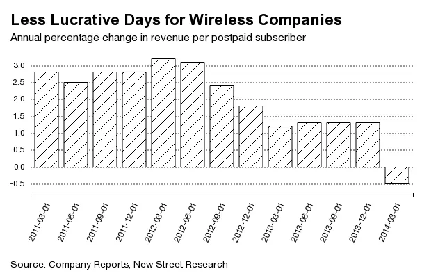 根据New Street Research对公司文件的分析,无线公司从每个用户身上赚取的金额在上个季度确实下降了。这是至少三年来首次出现同比下降。