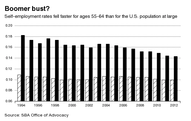 但婴儿潮企业家的崛起尚未发生。根据小企业管理局倡导办公室的一份(PDF)最近报告,临近退休的美国人的自雇率在过去二十年中稳步下降。而55至64岁美国人的自雇率下降速度快于所有年龄段的自雇率。