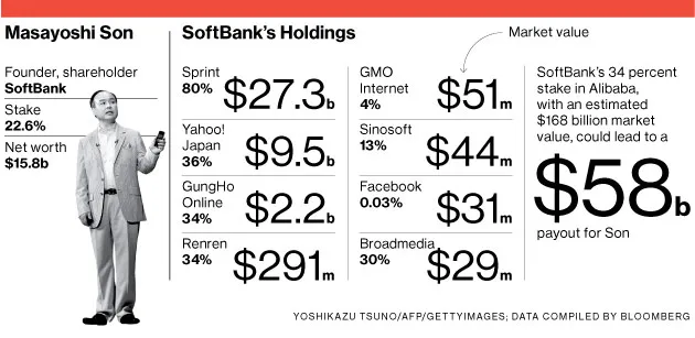 这意味着要对由来自中国东部城市杭州的前英语教师马云创办的互联网初创公司进行投资。得益于这项初始投资和后续投资,软银现在拥有阿里巴巴34%的股份,阿里巴巴如今是一家涵盖企业对企业网络门户、在线零售、购物搜索引擎和云计算的强大企业。这家中国公司于5月6日向证券交易委员会提交文件,计划在纽约推出首次公开募股,预计将在今年晚些时候进行,可能超过2008年 Visa 筹集的179亿美元,使得这次股票首次亮相成为美国历史上最大的一次。根据彭博社汇总的分析师估值共识,软银的持股价值将达到580亿美元,阿里巴巴的市场价值约为1680亿美元,这进一步增加了孙正义在过去二十年中组建的投资组合,其中包括对美国第三大运营商 Sprint 的控股; 雅虎日本;以及大约1300家其他企业。