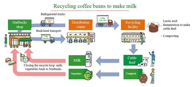 美尼康与麻布大学的兽医学系合作开发了基于咖啡的牛饲料,基于其在实验稻草(作为新隐形眼镜材料研究的一部分)时提出的发酵技术,依据一份声明。2013年,美尼康、星巴克和废物处理公司三友植物服务共同申请了该饲料的专利。这些咖啡渣还用于堆肥,以肥沃牛只放牧的土地。以下是循环运作的示意图。