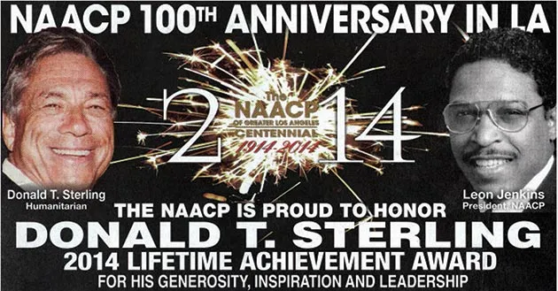 唐纳德·斯特林在2011年5月洛杉矶斯台普斯中心的一场比赛前站在场边摄影:斯蒂芬·邓恩/美联社全国有色人种协进会在4月迅速行动,取消了授予洛杉矶快船队老板唐纳德·斯特林的终身成就奖的计划。斯特林是一位长期支持NAACP的贡献者,他在录音中训斥一位女性朋友,因为她在网上发布了与黑人朋友的合影。许多人对这个民权组织曾打算表彰一位有歧视黑人历史的男子感到惊讶。他们不应该感到惊讶。在2009年,NAACP洛杉矶分会曾授予斯特林总统奖,正是在他同意支付280万美元以解决联邦民事指控之前,这些指控称他在自己拥有的洛杉矶公寓大楼中不公平对待黑人和西班牙裔。