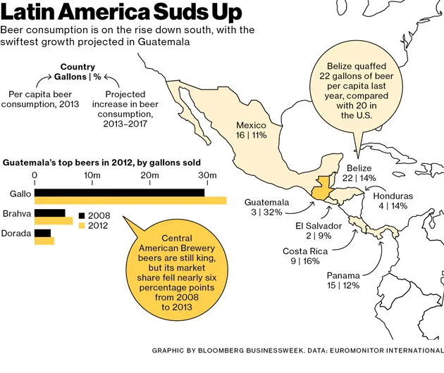 危地马拉对Ambev来说也具有战略重要性,因为它邻近墨西哥,AB InBev在墨西哥控制着Grupo Modelo,Corona的制造商。2012年,该公司宣布计划吞并它尚未拥有的Grupo Modelo部分。在一次投资者演示中,它自豪地表示,墨西哥是继美国、巴西和日本之后第四大最盈利的啤酒市场。AB InBev最不希望的就是中美洲酿酒厂通过向墨西哥注入更多的Gallo来玷污其在墨西哥的胜利。