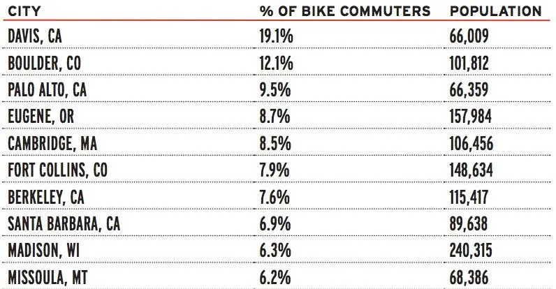 美国十个自行车通勤者比例最高的城市中,没有一个人口超过250,000。美国自行车联盟另一个数据来源证实了中型城市自行车骑行的强劲增长。最新的两次全国家庭出行调查(2001年和2009年NHTS)报告称,在人口在500,000到1,000,000之间的城市,自行车出行的目的增长了64%,而在250,000到500,000之间的城市,自行车出行增长了42%。此外,现有的城市统计数据低估了城市内部自行车骑行的增长:它们包括广阔的郊区地区,由于密度较低、行程距离较长以及缺乏自行车基础设施,自行车骑行很少。