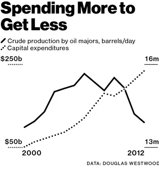从长远来看,问题可能是石油的不足。原油的生产成本正在变得越来越高。自2005年以来,主要石油公司在勘探和生产上的支出每年增加14%,但其总产量却下降。这使得许多大型石油公司在2014年降低了资本支出:埃克森美孚已宣布将削减6%的支出,雪佛龙削减5%。荷兰皇家壳牌计划在今年减少20%的支出。“大型石油公司在勘探成本上被活活吞噬,”普林斯顿能源顾问公司的石油分析师史蒂文·科皮茨说。资深能源分析师查尔斯·麦克斯韦表示,今天的支出不足最终将导致价格上涨。“这将对我们造成重大影响,”他说。“2019年将会是地狱。”