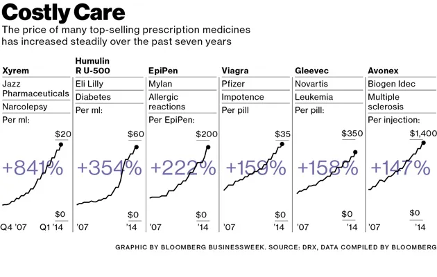 绝望也在推动价格上涨,制药公司提高专利产品的价格,以弥补失去保护的畅销药物的销售下降。而拥有老药的公司在竞争对手出现时也会提高价格,或者是为了与新药的价格持平,或者是为了弥补失去的处方。尽管保险公司和政府推动的仿制药现在占美国所有药物的86%,但这并没有减少处方药的总支出。根据政府数据,2012年,美国人花费了2630亿美元,比2007年的2360亿美元增加了11%。