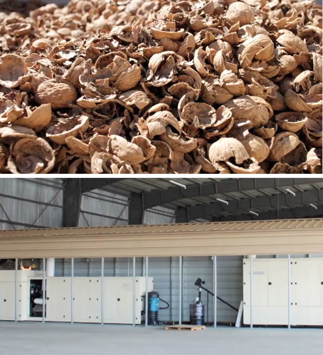 在加利福尼亚北部的 迪克森岭农场,可以找到一个更高效的生物质能源回收操作,这是美国为数不多的将坚果壳现场转化为电力和热量的农场之一。使用一种名为 BioMax100 的技术,迪克森岭将160万磅的核桃壳转化为足够的燃料来为农场供电一年——这相当于每年840,000千瓦时,100%的热量用于秋季干燥坚果和冬季加热建筑。老板拉斯·莱斯特表示,虽然典型的蒸汽发电厂的效率约为17%到18%,但他的操作达到了约85%。