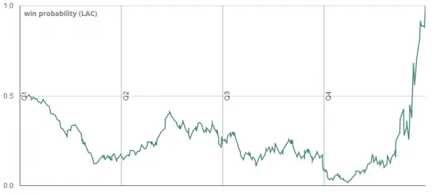 在那一刻,如果你在接受实时投注的在线网站上(例如Betfair和Stan James)下注快船会逆转获胜,根据迈克尔·比尤的计算,你可以赚到57倍的回报,他运营着体育数据可视化网站Inpredictable。在落后16分后,快船以35-17的攻势结束比赛,最后由达伦·科里森在比赛还剩32秒时上篮得分。