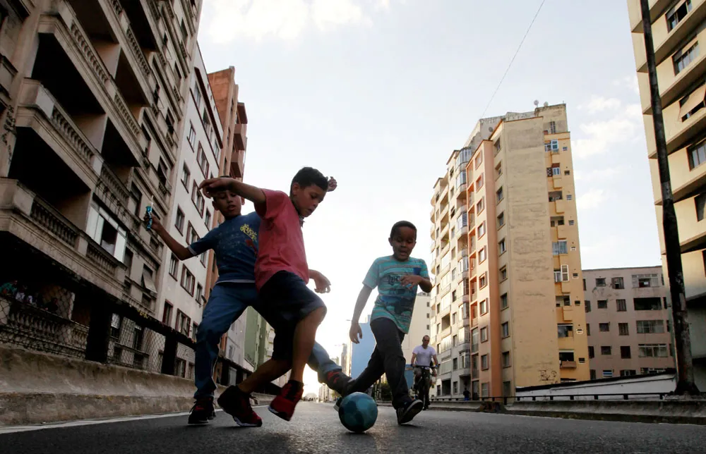 男孩们在圣保罗这座世界杯主办城市的街道上进行周日的“pelada”足球比赛,该街道当天关闭交通,2014年5月4日。路透社/保罗·维塔克