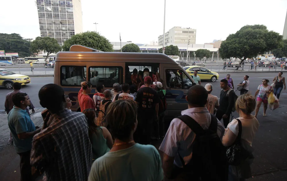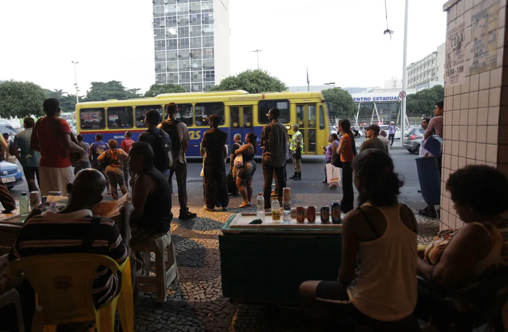 街头小贩观察人们在公交车站等候交通工具,时间是2014年5月8日,里约热内卢发生公交罢工。罢工在即将到来的世界杯足球赛前一个月,引发了对服务和公共秩序的担忧。此事件发生在一名舞者在警察枪战中遇害后两周,导致该市最受欢迎的旅游区附近的贫民区发生骚乱。路透社/里卡多·莫拉斯