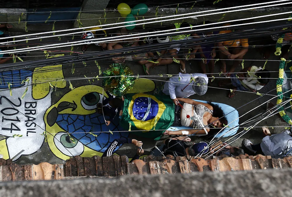 居民在2014年5月10日于里约热内卢的雅卡雷津霍贫民区举行抗议活动,模拟公共医院的糟糕服务,抗议活动由非政府组织(NGO)和平之河(Rio de Paz)组织。该抗议活动旨在提高公众意识,并改善公共服务以达到国际足联的标准,组织方表示。路透社/塞尔吉奥·莫拉斯
