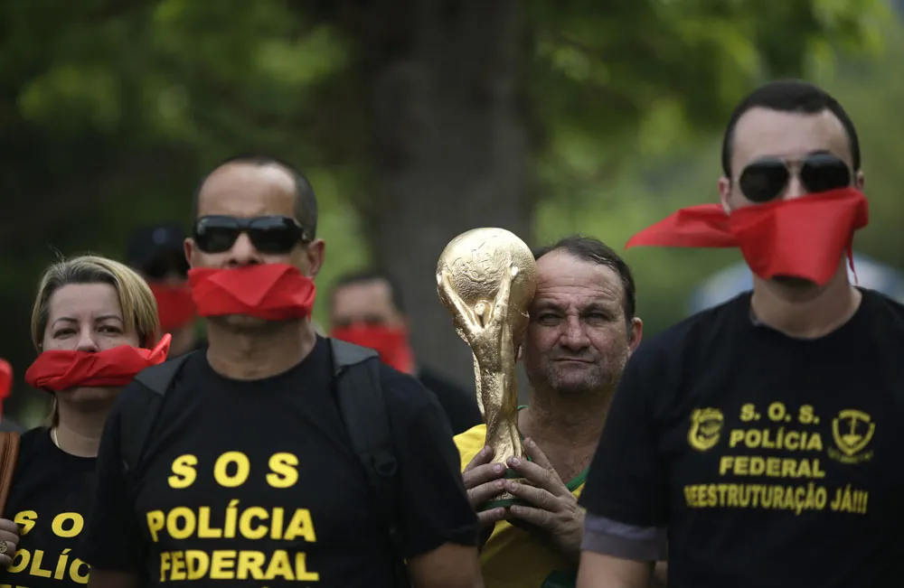 一名足球迷手持世界杯奖杯复制品,站在抗议加薪和改善工作条件的联邦警察中,地点是在2014年5月7日里约热内卢,巴西国家足球教练路易斯·费利佩·斯科拉里宣布2014年世界杯巴西队名单的音乐会外。路透社/里卡多·莫拉斯