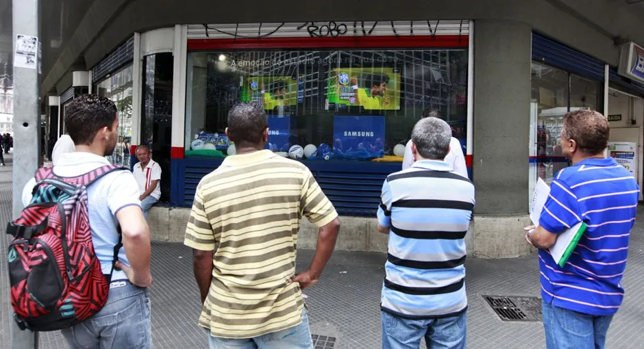 顶部图片:人们在电视上观看巴西国家足球队主教练路易斯·费利佩·斯科拉里在里约热内卢的新闻发布会,时间是2014年5月7日。斯科拉里宣布了将参加2014年巴西世界杯的23名球员的名字。2014年。(路透社/保罗·惠特克)