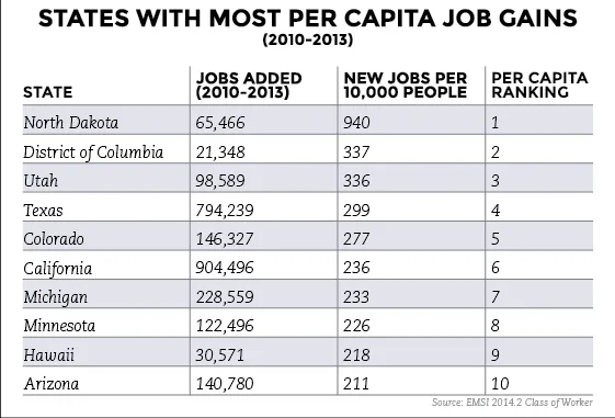 从人均角度看就业增长使我们能够更好地了解各州在复苏过程中表现如何。例如,加利福尼亚州在2010年至2013年间新增了超过90万个新工作岗位,远远超过任何其他州。但这个总体统计数据忽略了一个重要部分。加利福尼亚州是一个巨大的州,拥有3800万人口——比整个加拿大还要多——根据人均就业增长,加利福尼亚州排名第六。每1万居民新增236个工作岗位,落后于四个州和哥伦比亚特区。